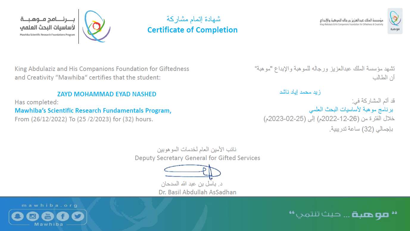 26/12/2022 -25/02/2023 Participated in Mawhiba Scientific Research Fundamentals Program (32 Hours)